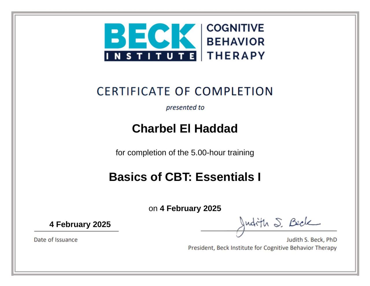 As a Clinical Psychotherapist, Charbel specializes in delivering evidence-based therapeutic interventions for individuals navigating trauma, emotional challenges, and behavioral health concerns. His approach integrates advanced training in Cognitive Behavioral Therapy (CBT), enhanced through professional development at the Beck Institute, a globally renowned authority in evidence-based psychotherapy. This expertise allows him to provide highly tailored and effective care to each patient.