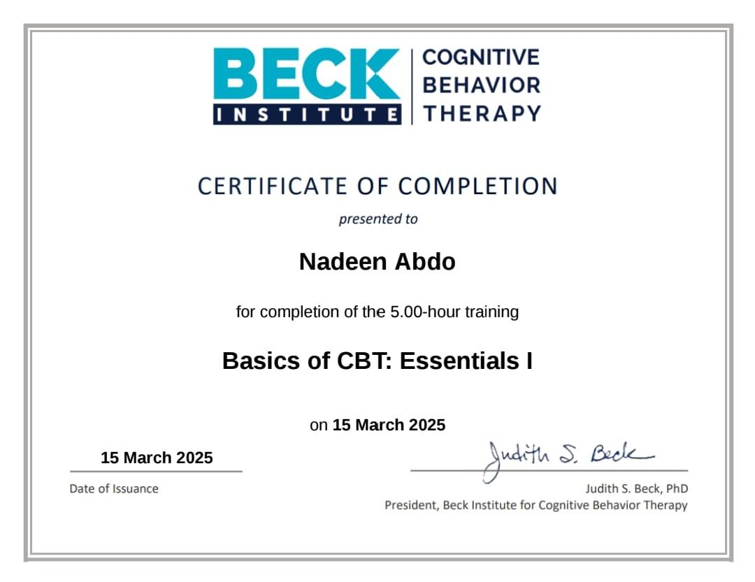 At Cognitive Analytica, Nadeen provides evidence-based psychotherapy primarily grounded in Cognitive Behavioral Therapy (CBT). She is Beck-trained in the treatment of anxiety and personality disorders and has additional training in Play Therapy, psychosocial support, and trauma-informed care. Her clinical experience includes crisis management, suicide prevention, projective assessment, and therapeutic work with children and adolescents with special needs.